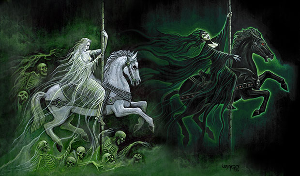 As you draw near the magnificent carousel of fabled beasts, the calliope music begins and the carousel starts to turn. Antique horses whisk past alongside dragons, griffins and other mythical creatures that have been carved and painted with unearthly detail. A dark, swirling mist forms above a black stallion with eyes of blazing hellfire. As it passes before you, a sinister rider materializes in the beast's jeweled saddle. A darkly regal woman draped in flowing black tresses commands the demonic stallion. The shadowy wraith turns her head to cast a wicked smile in your direction. Another beautiful female phantom appears atop a pale horse that seems to be no more than a cadaverous skeleton. The carousel spins wildly and other ghostly spirits appear and vanish as the horses rise and fall.