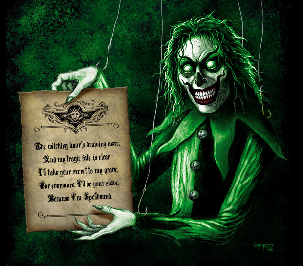 The sound of an old-time phonograph draws you to a darkened tent. Inside you discover a small stage. The curtains draw open to reveal a marionette adorned in the guise of a sinister clown. The clown's arms and legs are attached to puppet strings by barbed fishhooks. The maniacal marionette holds a piece of tattered parchment that displays the lyrics to the song that is playing on the phonograph.