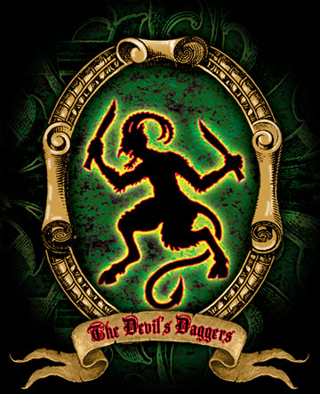 The main attraction is a death-defying act called Diablo & The Devil's Daggers. The master showman steps into the spotlight, followed by his beautiful assistant. The scantily-clad girl steps to the center of the stage where she is strapped to a large wheel, bound by her wrists and ankles. Diablo points a gloved finger at his tethered assistant and the wheel begins spinning. Diablo throws back his crimson cloak to reveal 13 razor-sharp knives lining his jacket. He raises the first dagger high and it bursts into flames. The crowd cheers wildly and Diablo hurls the dagger at the captive beauty. The blade finds its mark right beside the girl's throat. He produces another knife, then another, and launches his deadly daggers with masterful precision. End over end, the fiery blades soar toward the wheel, hitting their marks dead center. As more and more flaming daggers hit the target, the wheel spins faster and the assistant becomes engulfed in a mass of swirling fire. When the last of the devil's daggers has been thrown, the wheel grinds to a halt and the flames die down to reveal a charred skeleton strapped to the target that, only a few moments ago, held the lovely assistant. The crowd roars and Diablo raises his arms, then is himself consumed in fire. The walking inferno steps to center stage where the flames die down to reveal a skeleton, still wearing Diablo's costume. The skeletal figure removes his top hat and takes a bow, then crumbles to dust in one final blaze.