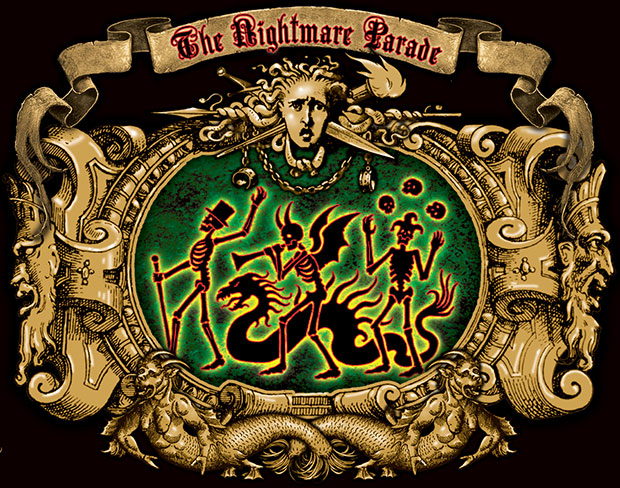 The sound of drums breaks the calm and warns you that a parade is approaching. You conceal yourself in the shadows as the music draws near. Nightmarish shapes emerge from the mist. A troupe of life-sized marionettes, painted in the likeness of maniacal harlequins, lurch and stagger along as they play a sinister refrain on trumpets and drums. Four black horses pull a wagon that holds a covered cage, and frightening sounds emanate from the captive monstrosities within. The Ringmaster follows the wagon and cracks his bullwhip to quiet the savage beasts. A pair of hulking clowns clumsily juggle a human skull and two large bones between them as a devilish looking man donning a tophat and scarlet cape waves several flaming daggers high for all to see. Finally, a snake charmer wearing a jeweled turban plays his hypnotic melody on his pipe, followed by two black vipers and a larger white serpent. The parade enters the large circus tent at the farthest end of the carnival.