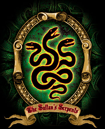 Strange sounds draw you to a dark tent adorned with Arabian symbols intertwined with snakes. Exotic piping music accompanied by rhythmic drumming casts a hypnotic spell and beckons you to venture within. A man wearing a jeweled robe and turban sits on a silken rug in the middle of the room and plays a dark melody on an intricately carved pipe. Three large woven baskets sit on the ground before him.