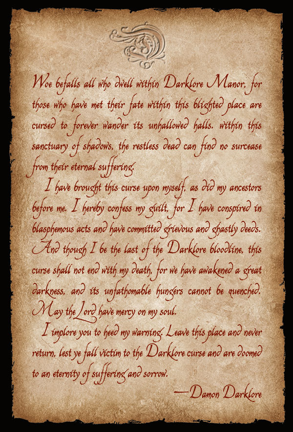 On Halloween night in 1971, Darklore Manor was the scene of a mysterious fire, and the mansion burned to the ground. The official police report lists the cause of the fire as arson, however, there are rumors of a cover-up concerning certain facts of the investigation including the discovery of skeletal remains of several bodies found deep in the foundation of the ruins. Though few traces of the mansion remain, reports of the Lady in Black continue to this day near the site of the old manor house, and the mystery of the Darklore curse remains unresolved.