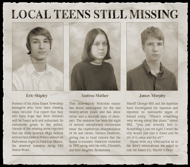 The Darklore curse reached its zenith in 1968 when three area teens were reported missing after setting out to hold a séance inside the mansion on Halloween night. Seventeen year old Eric Shipley, along with sixteen year old James Murphy and Andrea Mather were never seen again. Theories have arisen that the teens somehow gained access to the mansion and, once inside, the three held a séance to speak with the dead. But instead of merely communing with spirits, they disturbed and awakened some unnatural force that trapped them within the house and eventually caused their deaths.